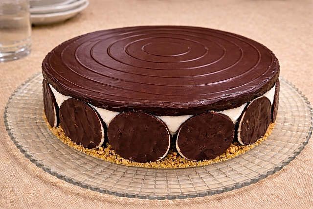 Posicione as bolachas calipso ao redor da forma, com o lado do chocolate virado para fora — isso dá aquele visual clássico e elegante.